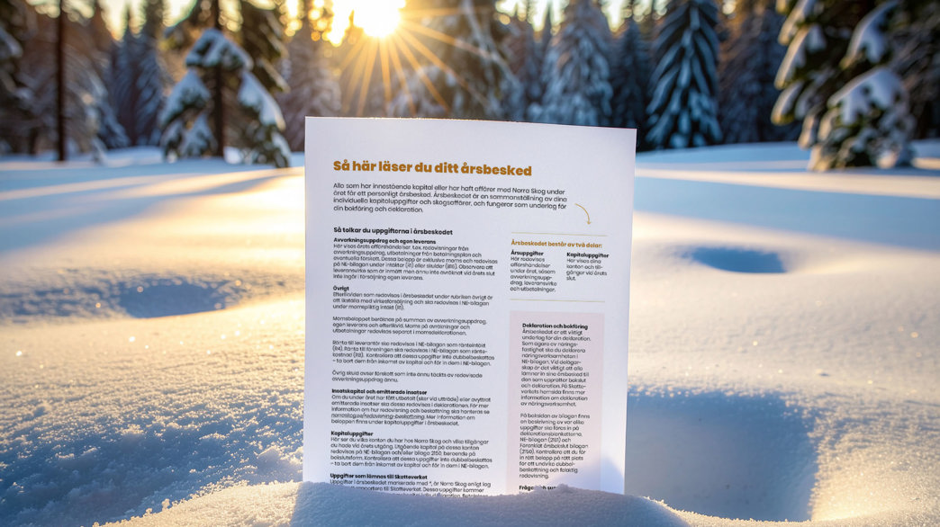 Om du under året har fått utbetalt (sker vid utträde) eller avyttrat emitterade insatser ska dessa redovisas i deklarationen. För mer information om hur redovisning och beskattning ska hanteras se norraskog.se/redovisning-beskattning. Mer information om beloppen finns under kapitaluppgifter i årsbeskedet.