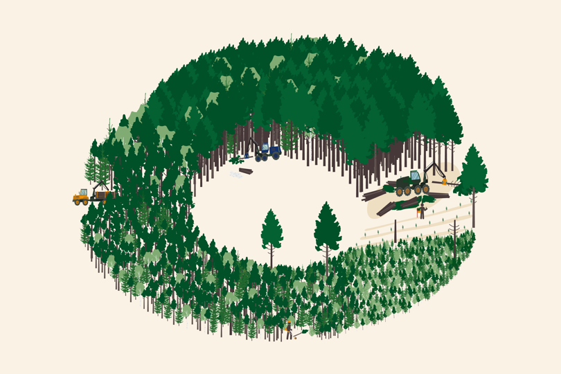 Det svenska skogsbruket bygger på ett kretslopp i flera steg. När ett område avverkas planteras alltid nya träd – ofta två eller fler för varje träd som tagits ned. Skogen växer långsamt, men binder som mest koldioxid när den är 30–40 år. Med rotationsskogsbruk finns alltid skog i olika åldrar i landskapet. En skog behöver ungefär 70–80 år för att bli fullvuxen.